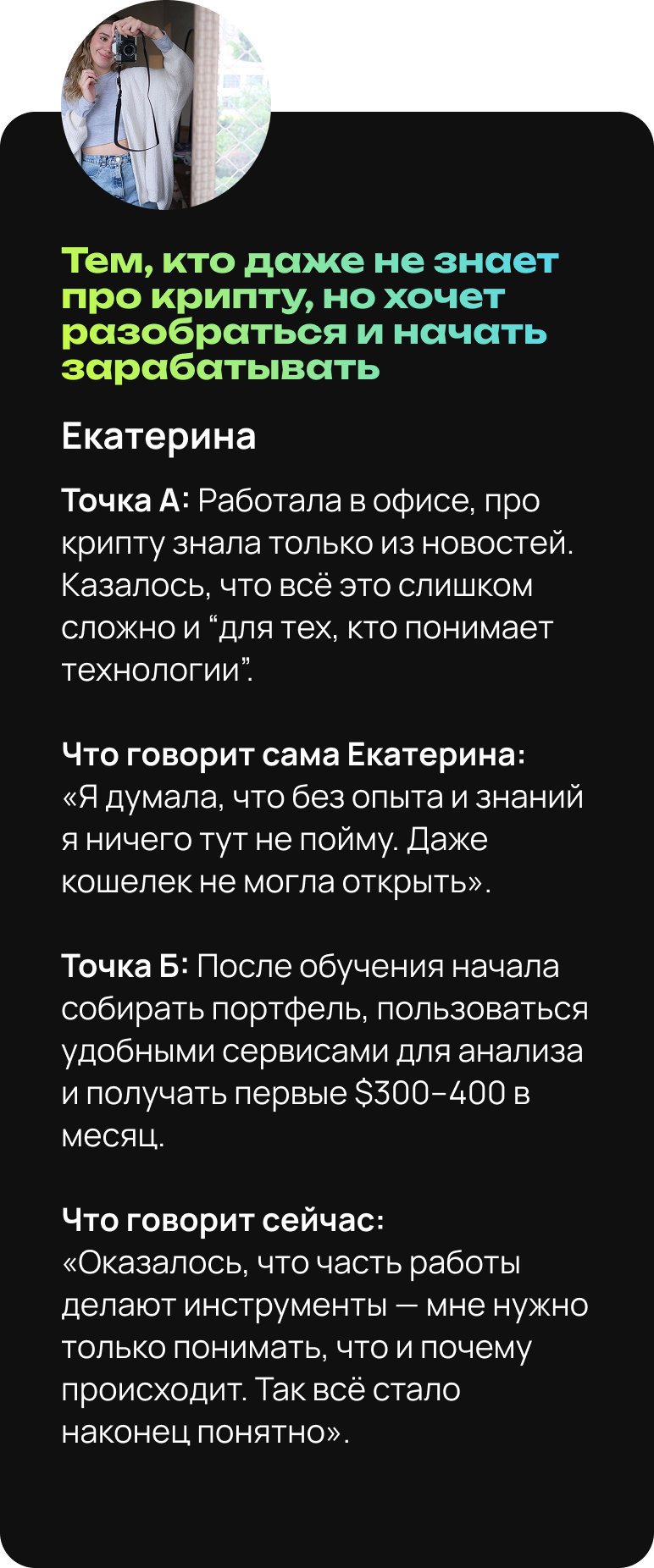 Очень много людей теряют свои накопления. Некоторые ученики приходят ко мне на обучение только после того, как потеряли свои $1 000–$3 000. Не совершайте таких же ошибок — приходите на онлайн-урок. Для безопасного старта этого будет достаточно!